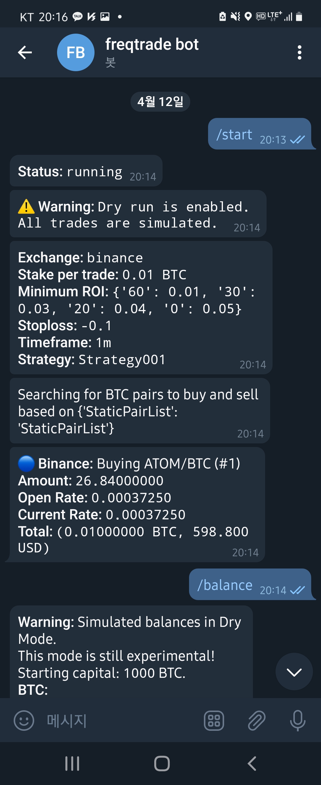 위 명령어를 실행하면, 트레이딩 봇이 동작하면서 telegram의 bot 채팅방으로 아래와 메시지가 날아온다.