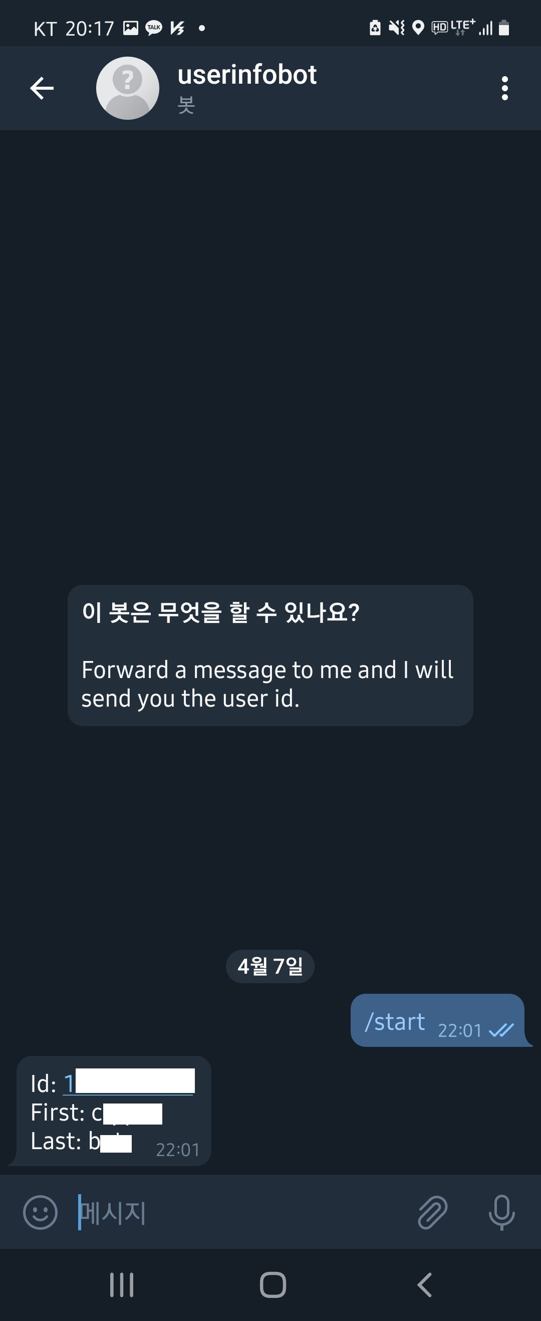 - BotFather와 동일하게 userinfobot을 검색 후 대화를 시작해 /start 명령어로 user id 검색. 이 user id도 config.json 파일에 적용