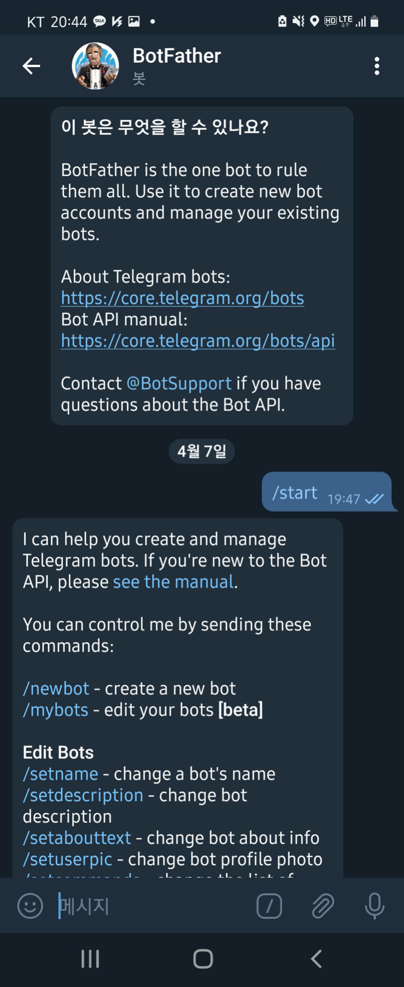 - BotFather 검색 후에 대화를 시작