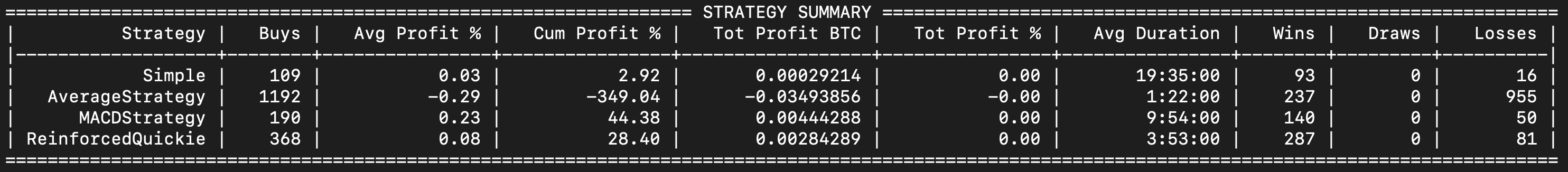 >> backtesting --strategy-list Simple AverageStrategy MACDStrategy ReinforcedQuickie --strategy-path ./user_data/strategies/berlinguyinca --ticker-interval=5m